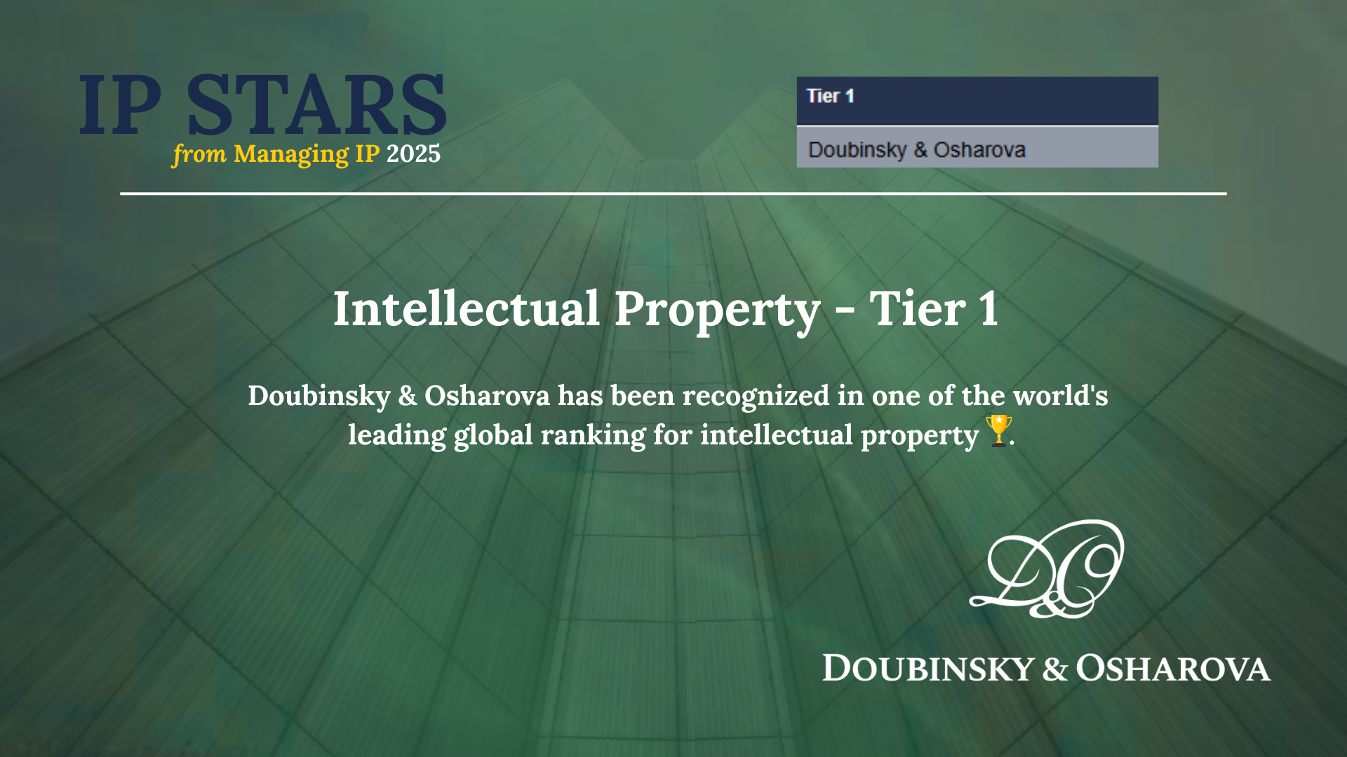 Міжнародне видання IP STARS оприлюднило результати щорічного дослідження у сфері інтелектуальної власності. За підсумками рейтингу IP STARS Intellectual Property Rankings for Ukraine 2025, Doubinsky & Osharova вчергове визнана фірмою Tier 1 у сфері інтелектуальної власності в Україні.