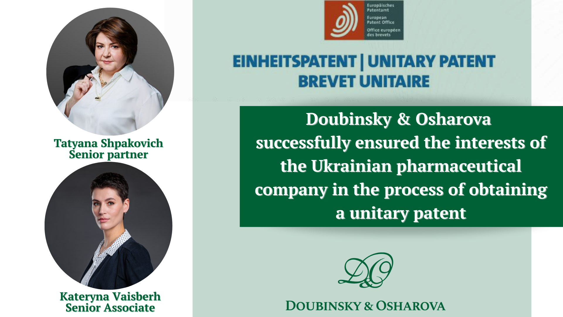 Команда "Doubinsky & Osharova" успішно забезпечила інтереси української фармацевтичної компанії в процесі отримання унітарного (єдиного) патенту, що діє на території низки країн Європи.