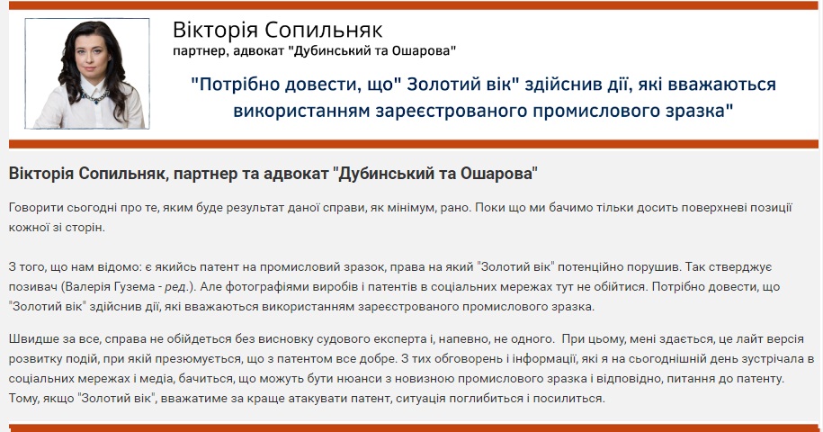 Про це Валерія повідомила в соціальній мережі і заявила, що подала позов до суду. В свою чергу, прес-служба "Золотого Віку" запевнила, що вони не копіювали вироби Guzema і можуть це підтвердити. Представники компанії також зазначили, що тренд на відкриті каблучки з кульками (приклад такої каблучки надала Гузема) з'явився на початку 21 століття в Італії і, якщо говорити саме про таку каблучку, то в їхньому модельному ряду вона з'явилася ще у 2016 році, тоді як за наданими Валерією документами патент на промисловий зразок вона отримала у вересні 2018 року.