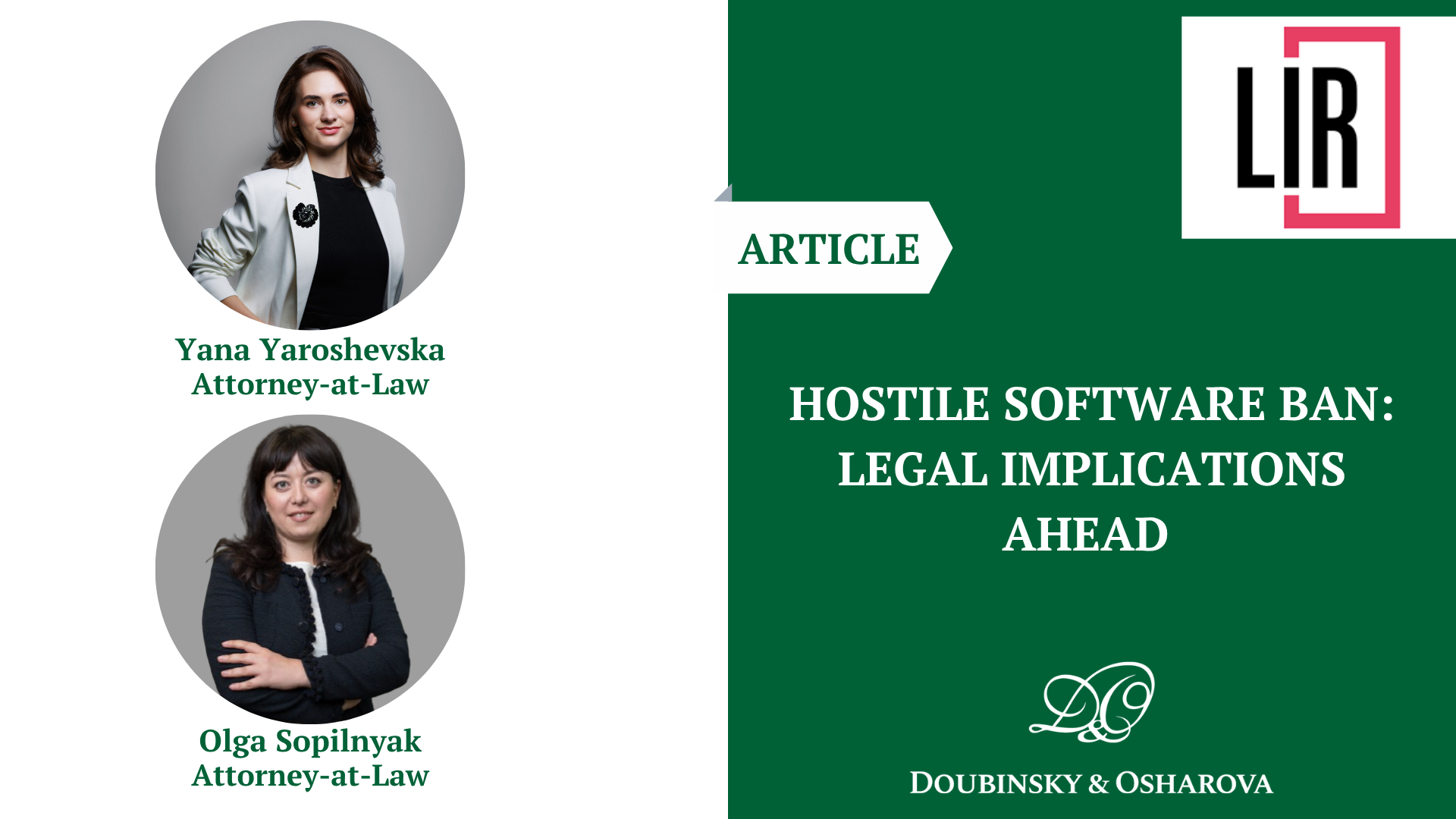 Адвокатки Doubinsky & Osharova Яна Ярошевська та Ольга Сопільняк стали співавторками статті “Заборона ворожого програмного забезпечення: майбутні правові наслідки”, опублікованої у 9-му випуску Legal Industry Reviews Ukraine.