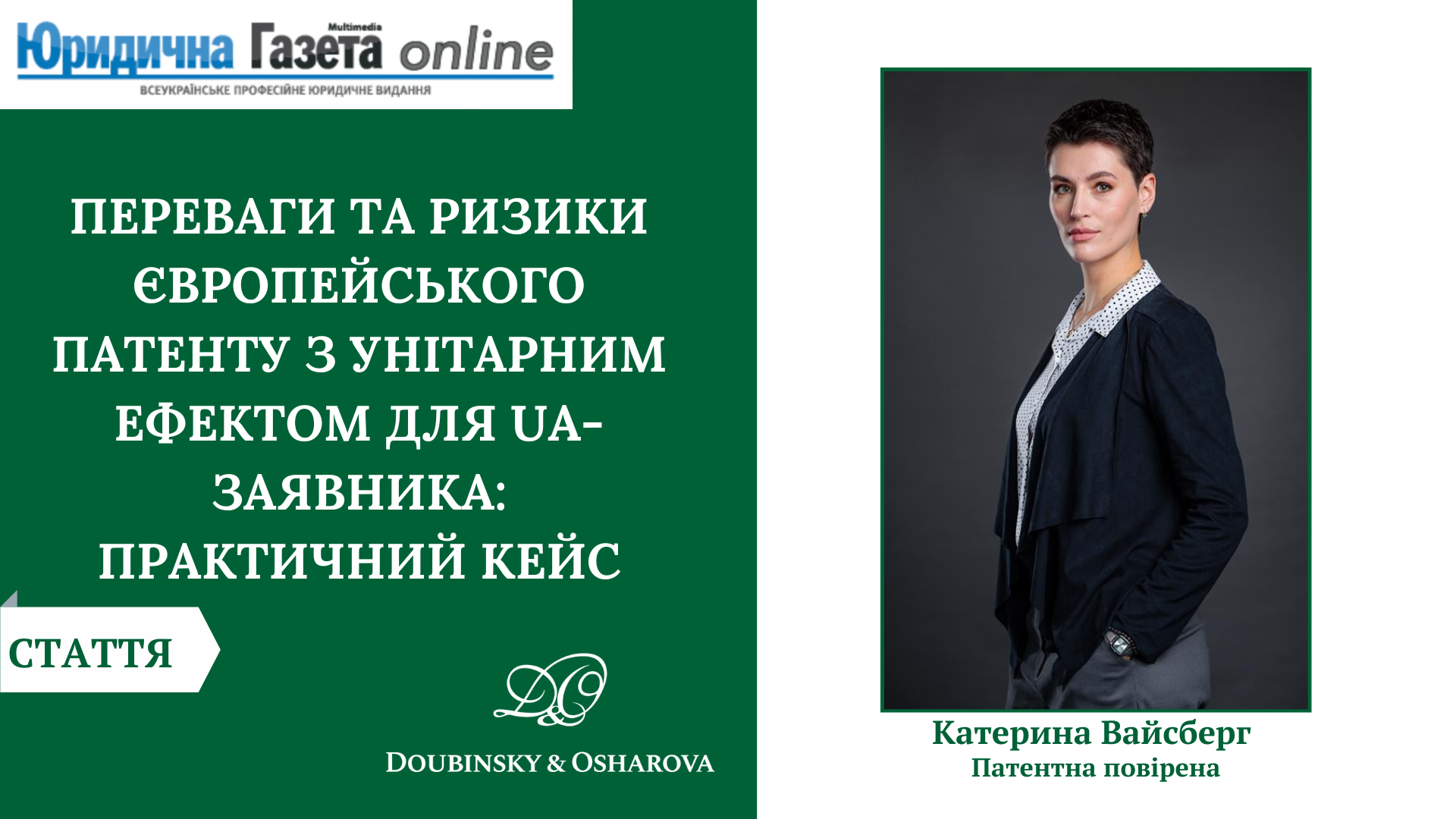 Патентна повірена України, спеціалістка з національного та міжнародного патентування «Дубинський і Ошарова» Катерина Вайсберг стала авторкою статті «Переваги та ризики європейського патенту з унітарним ефектом для UA-заявника: практичний кейс» для видання «Юридична Газета».