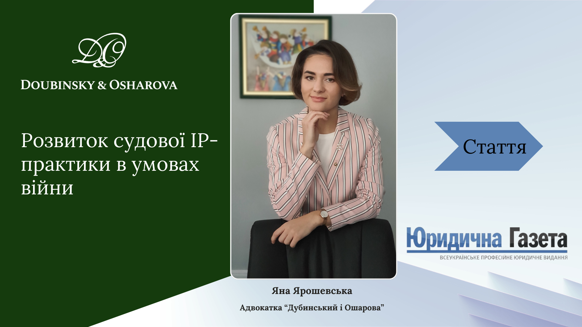 У своїй статті для Юридичної газети адвокатка «Дубинський і Ошарова» Яна Ярошевська аналізує тенденції судової IP-практики, важливі правові висновки судів та виклики, з якими зіштовхуються учасники IP-ринку в умовах війни.
