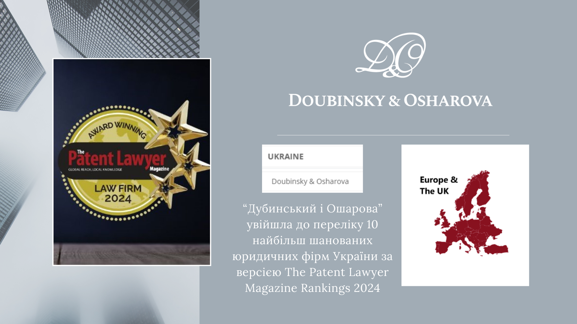 "Дубинський і Ошарова" увійшла до топ-10 найбільш шанованих юридичних фірм України у сфері патентного права за версією The Patent Lawyer Magazine Rankings 2024.