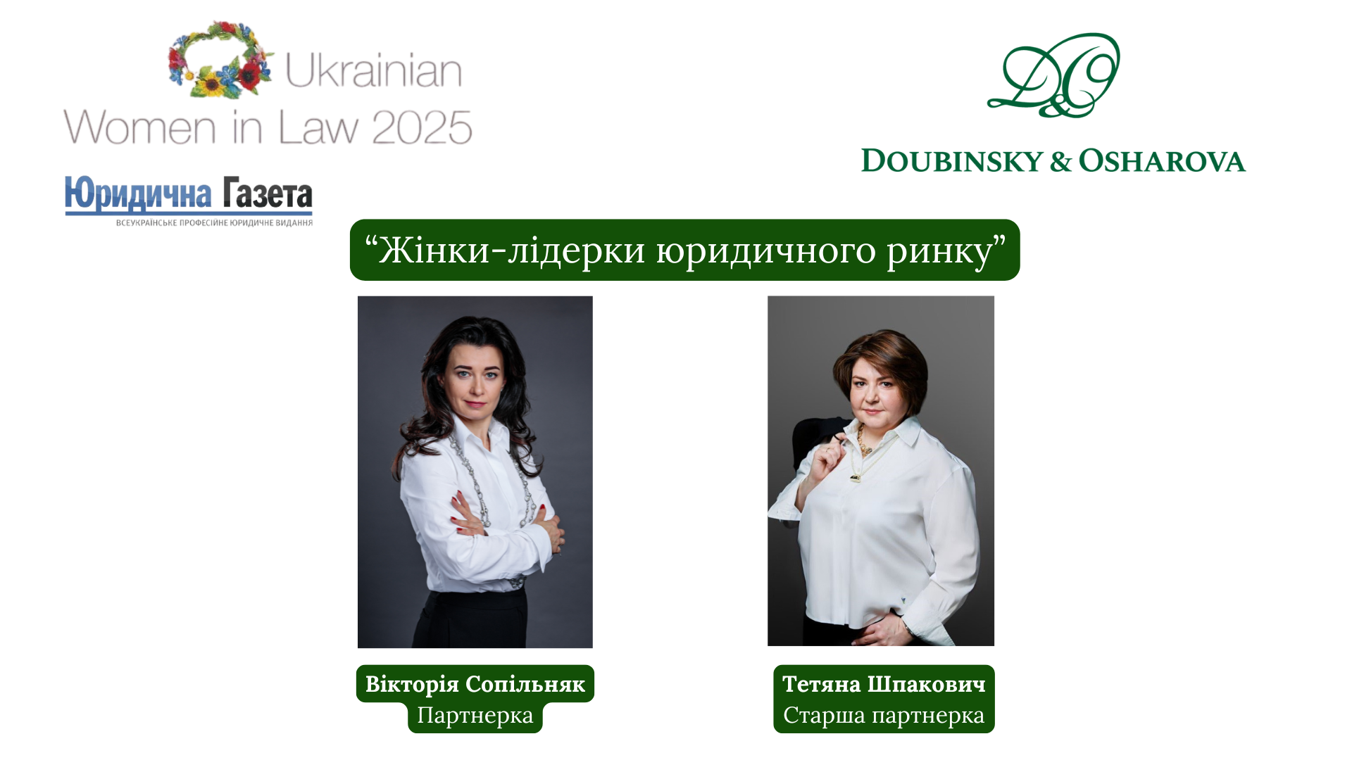 Ми з гордістю повідомляємо, що дві наші партнерки – Вікторія Сопільняк та Тетяна Шпакович – увійшли до списку «Жінки-лідерки юридичного ринку» за результатами рейтингу Ukrainian Women in Law 2025 від Юридичної Газети.