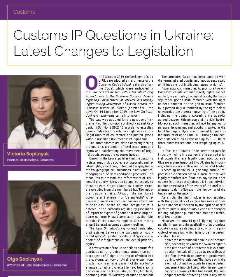Вікторія Сопільняк та Ольга Сопільняк підготували для видання Ukrainian Law Firms детальний аналіз новел та окреслили проблемні питання для правовласників: http://ukrainianlawfirms.com/reviews/customs/