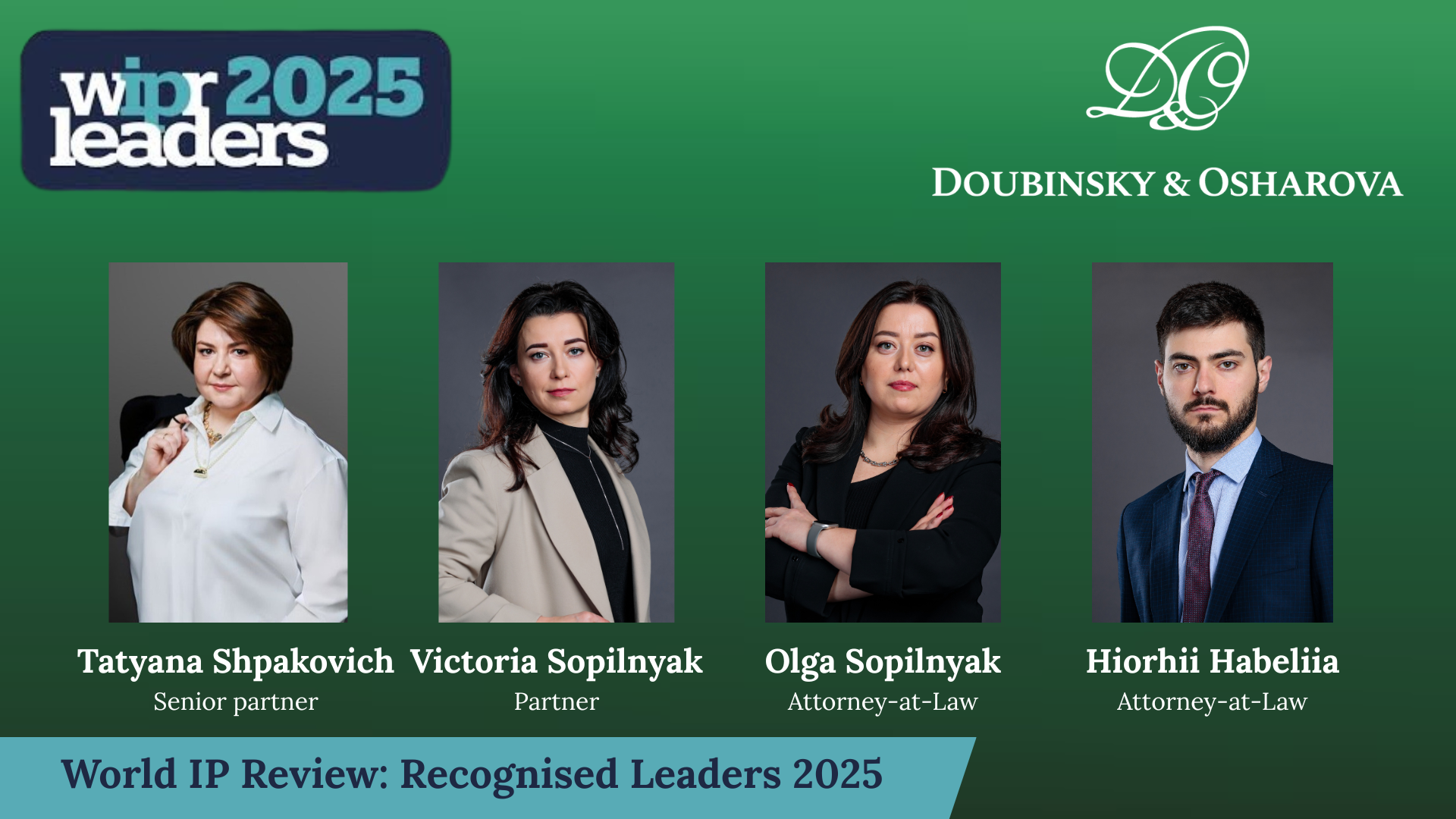 The WIPR Leaders 2025 guide (World Intellectual Property Review) has released its updated list of the world’s leading intellectual property professionals. We are proud to announce that four members of Doubinsky & Osharova have been recognized in this prestigious international ranking: senior partner Tatyana Shpakovich, partner Victoria Sopilnyak, attorney-at-law Olga Sopilnyak and attorney-at-law Hiorhii Habeliia.